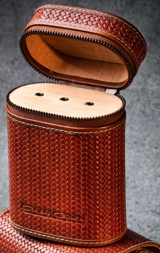 Here's a series of hard-leather, two or three-finger cases in a variety of finishes: smooth leather in multiple colors, woven leather, Croco or Ostrich patterns. Each sliding case can accommodate cigars of various lengths in hard-shell protection, including the most densely packed suitcase. And the top of each telescoping case has a hard, Buffalo horn top in a marvelous, glossy finish that makes each one unique.
